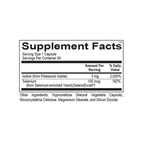 A synergistic blend of iodine, along with its trace mineral partner selenium, to help maintain iodine levels and reduce oxidative stress for optimal thyroid and breast health. Seleno-Iodide provides 3 mg of iodine combined with 100 mcg of selenium sourced from SelenoExcell, a highly bioavailable, organically bound selenium.