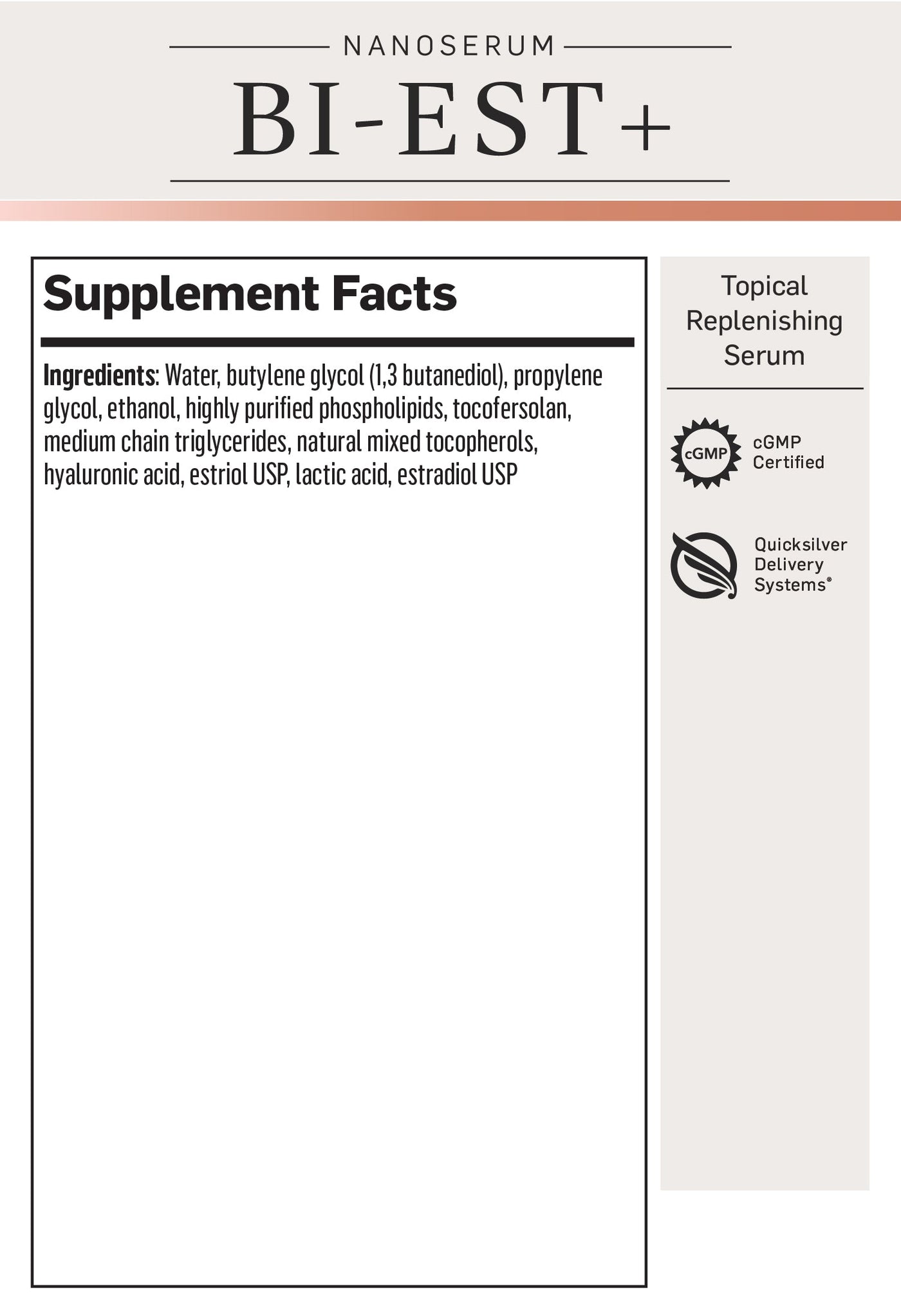 Bi-Est+ Topical Replenishing Serumis a nanoemulsified topical serum providing 1 mg of bioidentical estriol (E3) and 0.25 mg of bioidentical estradiol (E2) per 2 pump dose. The estriol and estradiol are derived from phytosterols, natural compounds used to synthesize bioidentical estrogens. Bi-EST+ is delivered using proprietary lipid nanoemulsion technology for enhanced absorption of ingredients.*