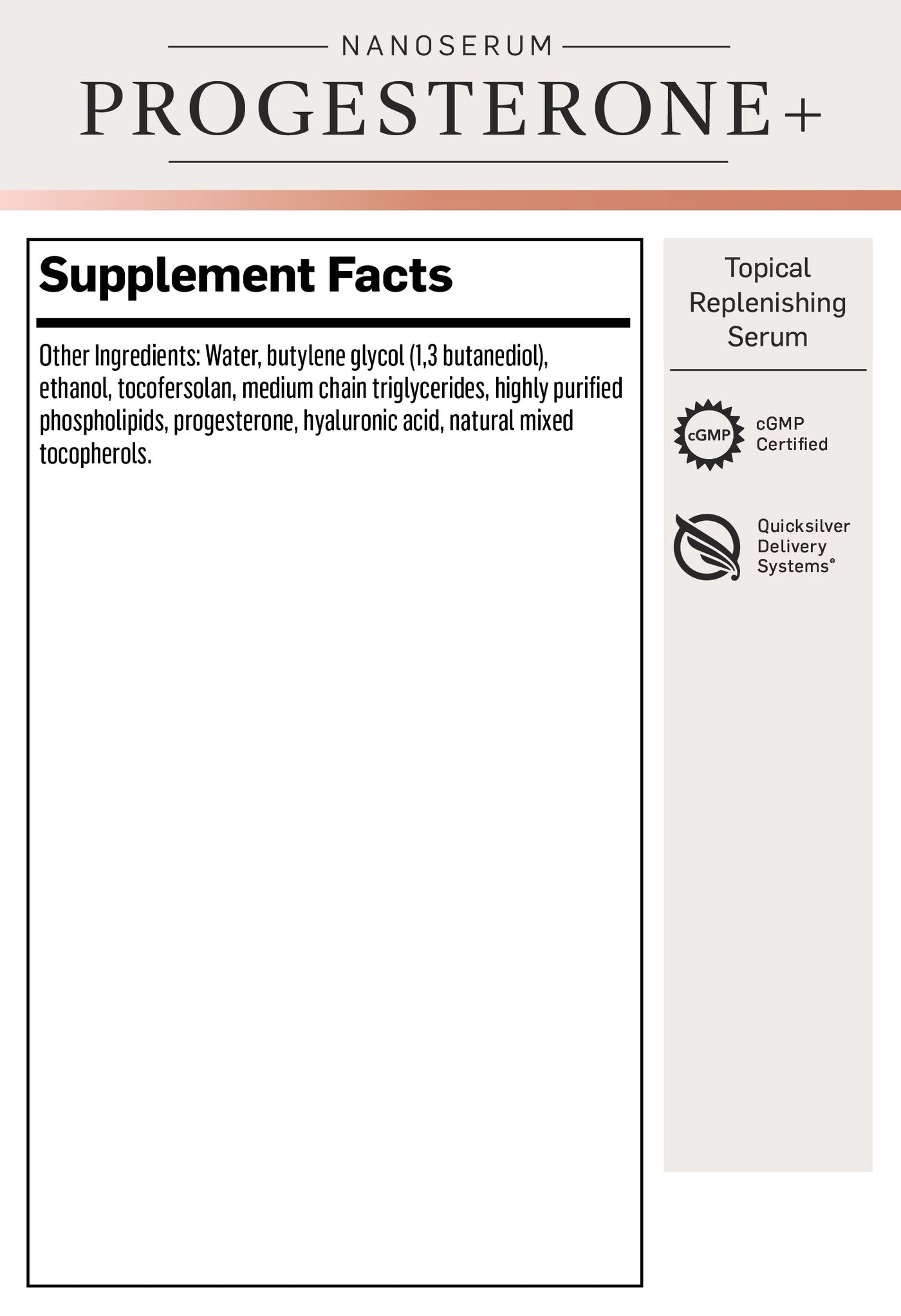 Progesterone+ Topical Replenishing Serum is our nanoemulsified, topical serum providing 8 mg of bioidentical progesterone per 2 pump dose. Our progesterone is derived from plant sterol diosgenin, a natural compound used to synthesize bioidentical progesterone.Progesterone+ is delivered using proprietary lipid nanoemulsion technology for enhanced absorption of ingredients.*