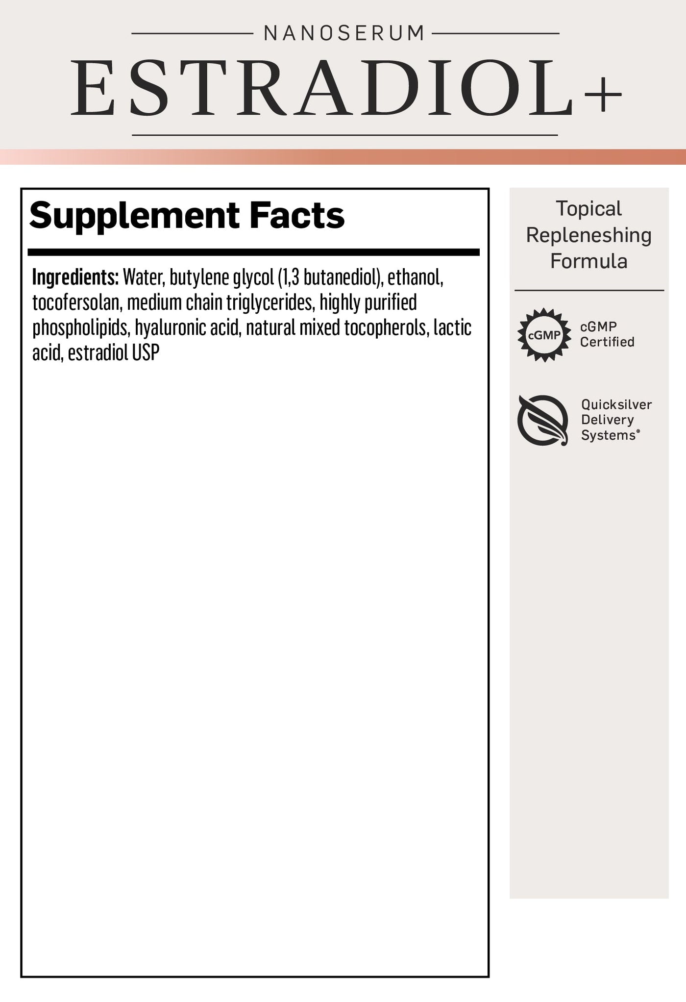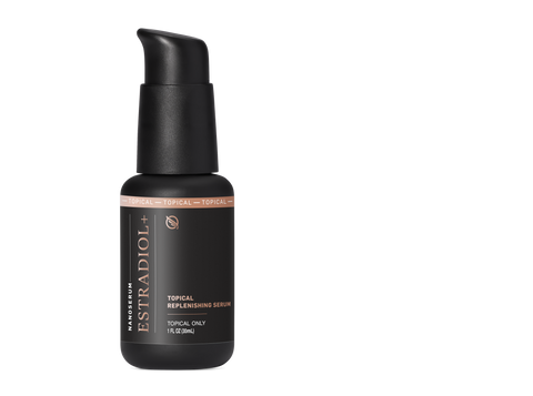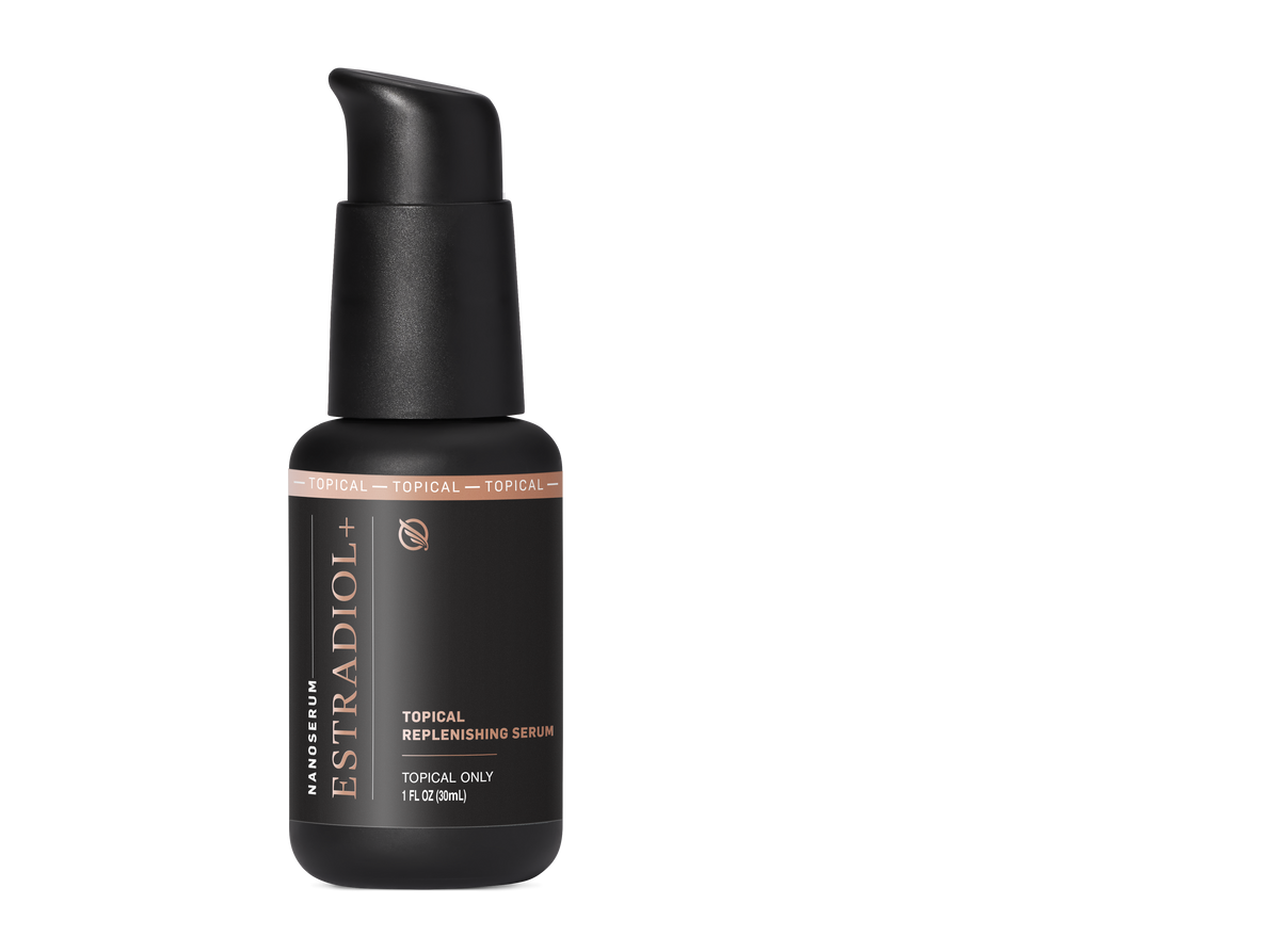 Estradiol+ Replenishing Serum is our patent-pending, nanoemulsified, topical estradiol serum providing .25 mg of bioidentical estradiol per .2 mL serving. Our formula consists of a micronized form of estradiol, housed in a nanoparticle phospholipid-base for enhanced absorption compared to conventional creams.